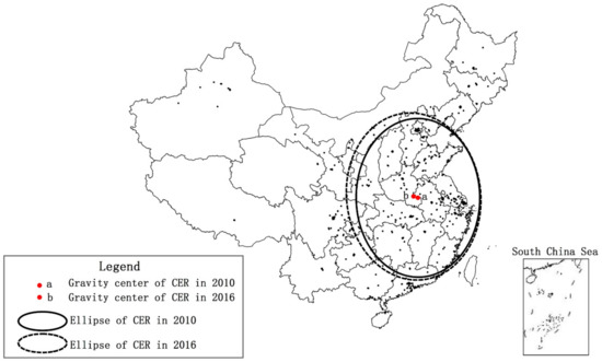 Spatial footprint analysis is a descriptive analysis of the elliptical distribution of CER performance and its spatial dynamics. Lefever’s standard deviation ellipse (SDE) method was adopted to measure the spatial footprint [90]. Next, the mean point of the SDE was calculated to measure the gravity center [91].