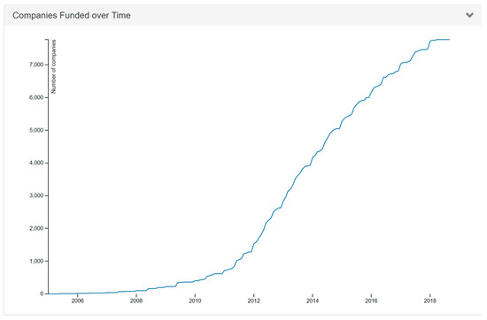 Figure 1. Number of companies who participated in accelerators and get funded over time. Source: https://www.seed-db.com/chartsandtables, [9] (accessed online on 6 May 2020).