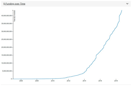 Figure 2. Funding (in USD $) raised by start-ups which participated in accelerators over time. Source: https://www.seed-db.com/chartsandtables, [9] (accessed online on 6 May 2020).