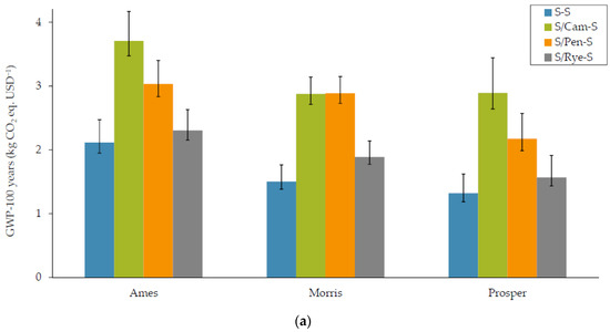 It must be stressed that some fertilized sequences such as S/Cam-S and S/Pen-S at Morris site had higher total GWP than the control (continuous soybean (S-S) sequence) while having lower N2O field emissions. This because, in an LCA, the other important contributor to the overall GWP in agricultural soils is the GHG emissions associated with the production phase of fertilizers, in particular N-fertilizers, whose production is energy-demanding [73]. As shown in Figure 1, the contribution of N-fertilizer production to the total GWP was the first source of GHG emissions for the sequences with the higher fertilization rate (S/Cam-S and S/Pen-S at Ames, where 126 kg ha−1 of N-fertilizer were applied over a 2-year period). In addition, in sequences with cover crops, fuel consumption is higher than conventional systems (due to a higher number of field operations such as sowing and harvesting or terminating the cover crop) and producing cover crop seeds for sowing has an associated environmental impact as well.
