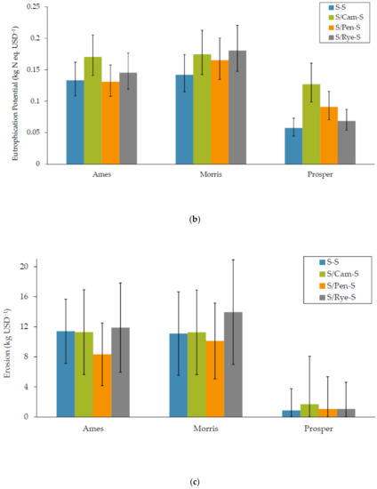 At Prosper, the introduction of the economic component in the assessment led to a major variation of the results across the three sites. When expressed with the FU1, all sequences with cover crops had lower GHG emissions than the control for the GWP impact category (Figure 1), while with the FU2 the control had the best performance (lowest GWP) and S/Cam-S turned out to be the sequence with the highest GWP USD−1 (Figure 6a). Sequences with camelina and pennycress were the most effective sequences to curb the eutrophication per ha year−1 (FU1), followed by the sequence with rye (Figure 2). Using the economic FU, sole soybean became the best system, while the sequences with camelina and pennycress had the highest eutrophication USD−1 (Figure 6b). The S/Pen-S sequence was the most effective to control erosion per ha year−1, followed by S/Cam-S, S/Rye-S, and the control (Figure 3). With the FU2, no sequence with cover crops performed better than the control (Figure 6c). Similar results were obtained for the SOC variation category as well, where the control became the best system for FU2.