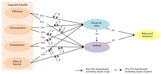 The existing studies somewhat display a different perspective in regard to the customer behavior depending on age and gender. The studies indicated that the younger generations are tech-savvy, and they are more receptive of innovative technologies [48,50,51]. Nonetheless, there are few studies that discovered contradictory results. For example, Ivanov et al. [47] determined that customers below the age of 30 exhibited fewer positive attitudes than the higher aged customers group. Their findings indicated that the younger customers are skeptical towards excitement, memorability, and pleasure through human–robot interactions. With regard to the difference according to the gender group, males generally tend to embrace innovative technologies more than females [21,49,50]. Conversely, there are studies that empirically determined that females are more inclined towards technological advancements than males. For example, Ivanov et al. [48] confirmed that female customers are more positive towards service robots than male customers. On the other hand, Dinet and Vivian [21] determined that gender does not play a moderating role to shape individual perceptions towards innovative technology. Likewise, the extant literature suggests the necessity to investigate whether the age and gender disparity in the effect of the expected benefits on perceived value and attitude exists in the context of smart hotels.