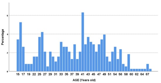 Secondly, Table 1 shows the age of participants segregated by gender. This first variable shown indicates that the median age of the participants is 40.00, 39.00 in men, and with an IQR of 20.00 for the whole sample. Likewise, Figure 1 is also provided to show the age distribution of adventure tourists in the sample.