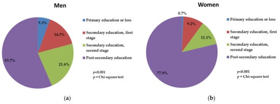 Significant statistical differences in the Level of Studies: (a) Distribution of frequencies of the variable level of studies in men; (b) Distribution of frequencies of the variable level of studies in women. Source: National Institute of Statistics (2019).