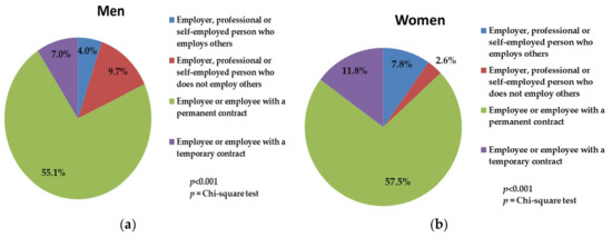 Significant statistical differences in the professional status in the job performed: (a) Distribution of frequencies of the variable professional status in the job performed in men; (b) Distribution of frequencies of the variable professional status in the job performed in women. Source: National Institute of Statistics (2019).