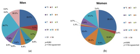 Significant statistical differences in the type of accommodation: (a) Distribution of frequencies of the variable type of accommodation in men; (b) Distribution of frequencies of the variable type of accommodation in women. Source: National Institute of Statistics (2019). * 1 = Hotel or apartment hotel; 2 = Hostel; 3 = Complete housing for rent; 4 = Room for rent in a private home; 5 = Rural tourism accommodation; 6 = Shelter; 7 = Camps; 8 = Cruise; 9 = Other market accommodations; 10 = Home ownership; 11 = Family, friend or company housing; 12 = Shared use housing; 13 = Swapped homes; 14 = Other non-market accommodations.