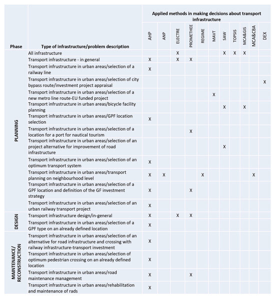 Application of multicriteria decision analysis (MCDA) methods in different phases of transportation projects of urban areas [13].