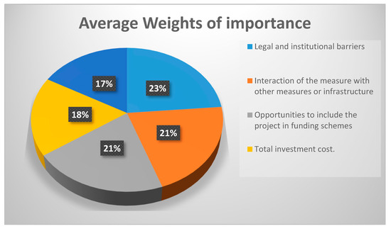 After calculating the objectives and the result indicators, the difficulty of applicability parameters’ average weights were also calculated. The values were given by the expert group in each one of the parameters, and are presented in the next Table 5 and Figure 4. The specific weights were also used in the next steps of the framework during the multicriteria analysis.