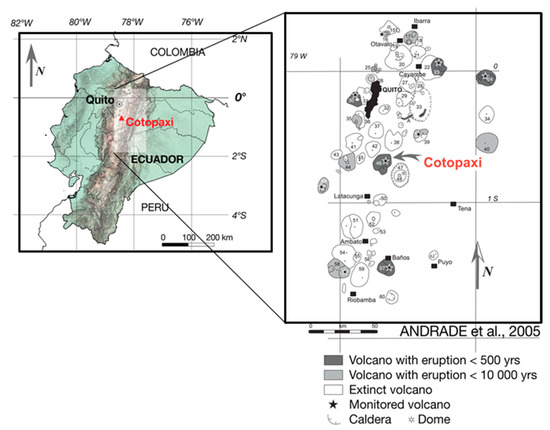 - Hall, M.; Mothes, P. The rhyolitic–andesitic eruptive history of Cotopaxi volcano, Ecuador. Bull. Volcanol. 2008, 70, 675–702. [Google Scholar] [CrossRef]