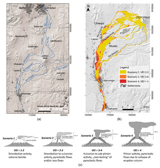 (a) Location of the Cotopaxi volcano and the main drainages and populated centres. (b) Estimated lahar footprints in the southern drainage system from three scenarios as function of the VEI (Volcanic Explosivity Index). (c) Brief description of the eruption scenarios expected at Cotopaxi in terms of the VEI. Modified after [64,69].