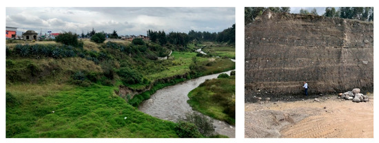 Latacunga is settled on ancient and recent geological materials formed by volcanic material. Some of the most representative and better-exposed stratigraphic formations of ancient ashes and lahar deposits originated from the previous volcanic activity of the Cotopaxi volcano were visited (Figure 3) with the guidance of experts from the Geophysical Institute of the National Polytechnic School (IG-EPN (Instituto Geofísico de la Escuela Politécnica Nacional (Quito, Ecuador))) and the Decentralized Autonomous Government of the Province of Cotopaxi (GADPC (GADPC, Gobierno Autónomo Descentralizado Provincial de Cotopaxi, Latacunga, Ecuador)). Some of these deposits are from pre-historical times, whilst the shallower ones date from the 1877 event that destroyed Latacunga [70]. Official maps of the Geological and Energy Research Institute (IIGE) and IG-EPN [71] were used during the field reconnaissance. This field trip was relevant to visualize the geological characteristics of the study area, as well as to strengthen the cooperation and idea exchanges with the local experts.