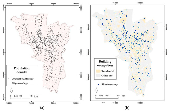 A design of the field surveying site was carried out. According to the last official census available [65] and population projections by the survey elaboration date (September 2019), 50,442 inhabitants over the age of 18 years were considered as qualified informants. In order to get a statistically representative sample, a confidence level of 95% and a margin of error of 5% were selected. On this basis, we estimated that a sample for the field surveys not smaller than 380 inhabitants had to be selected. Considering 10% additional surveys, a final sample size of 420 people was chosen. The population density (Figure 4a) was used to constrain the spatial distribution of the field surveys within the urban blocks with a residential occupancy (Figure 4b). The surveys were carried out by 55 students of the ISTC (Instituto Superior Tecnológico Cotopaxi) in September 2019.