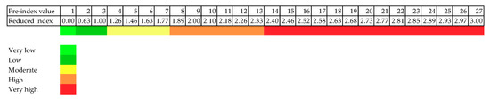 The numerator of Equation (1) can have a maximum possible value of 27, whilst the minimum for the resilience term in the denominator is 1. Therefore the maximum risk perception value that this method admits is 27. The values in the range from 1–27 form a “pre-index”. To obtain a more comprehensive numerical value, a “reduced index” in the 0–3 range is obtained through the application of Equation (2).