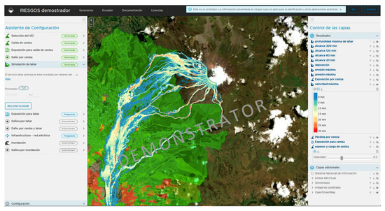 Precomputed hazard models of ash-falls and lahars are displayed by the RIESGOS demonstrator after the selection of a scenario in terms of the expected for an eruption of the Cotopaxi volcano. Local probabilistic ashfall models for the Cotopaxi volcano generated by the IG-EPN (following the method of [95] with 20-year observation of wind flow directions) are currently integrated as twelve explorative scenarios. They are represented by isolines (Figure A1). The lahar models described in [69] are incorporated, showing the maximum possible values of five physical properties (i.e., flow velocity, flow depth, pressure, erosion, and deposition (see Figure A2).