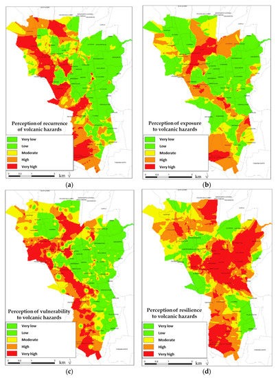 The formulated questions comprised in the survey forms are locally revised by experts from the APGR while paying attention to the use of collectively known terminology and the cultural characteristics of the community. In this work, we have implemented a simple numerical expression (Equation (1)) that equally ranks the risks factors of the different volcanic risk factors. This selection carries epistemic uncertainties. For instance, a customisation weighting schema to each factor, the selection of the median or mode instead of the mean value (herein adopted), together with a broader range in the Likert scale (e.g., 1 to 7 as explored in [104]) could be alternative approaches to be compared or even integrating each other into condition trees as proposed in [105]. The selection of the Likert scale to rank the answers and ultimately map the community perceptions implied an ordinal scale that was further converted into a nominal one based on the “equal-scale” (Equation (2)). This decision was made because, since the methods and results are aimed to be divulged, the categories have been found to be comprehensive, easily understandable, and culturally accepted by the community. Although the Likert scale has been extensively and recently used to successfully assess the community perception (e.g., [82,83,84,85,86]), there are several limitations in its adoption. For instance, as stated in [87], this kind of scale, despite maximizing the reliability of answers, also sacrifices the level of detail. However, it should be noted that through the simple possible answers related to the vulnerability perception and the nominal categories, we are only proposing a very simple categorization. More robust approaches that have addressed spatial multi-criteria analysis (as presented in [106]) have shown the impact of addressing diverse socioeconomic variables that we have not addressed in in our approach. A similar situation occurs with the resilience perception, which as discussed in [24], can be decomposed into very heterogeneous variables in economically developed countries.