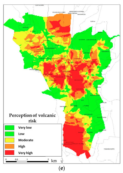 Every answer of the 420 field surveys was spatially distributed onto the survey locations (Figure 4). Their associated numerical values of the Likert scale were interpolated through the use of the ordinary kriging geostatistical algorithm [88]. Subsequently, every numerical value is converted to the equivalent categories presented in Figure 5. The spatially explicit categories represent the social perception of volcanic hazard recurrence, exposure, vulnerability, and resilience in the study area. They are respectively depicted in Figure 7a–d. The former factors are integrated through Equation (1) to generate Figure 7e, which represents the semi-quantitative volcanic risk perception index proposed in [77]. In general terms, the perceptions of hazard recurrence, exposure, and vulnerability are quite similar. However, in the central–easternmost and northernmost zones, there is a high perception of hazard recurrence, a very low perception of resilience, and a moderate perception of vulnerability, whilst in the southernmost part (where the Cutuchi River flows), the four assessed factors show high and very high values that ultimately lead to a generalized “very high” category in the volcanic risk index. This is contrary to what is observed in the central–western and northern parts. Due to the increasing distances from the main drainages, there is a strong anti-correlation between the higher resilience levels (reddish areas) and the other risk factors. Hence, despite the last volcanic crisis in 2015, there is still a generalised very low perception among the inhabitants that they cannot suffer any direct impact or damaging effect after increasing volcanic activity, because they consider the occurrence of lahars (within their lifetimes) to be impossible. Clearly, the inhabitants of that sector are not aware of the large intensities the Cotopaxi volcano can achieve (e.g., a Plinian activity (VEI > 4) in Figure 2).