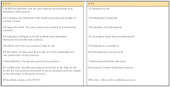 The general steps of the validation process are in Figure 1. To identify the key competences for SI, we first identified the three main bundles of competences for SI: Accelerating transitions, promoting innovation, and driving entrepreneurship. Transitions involve profound changes in a system across different dimensions: technological, material, organisational, institutional, political, economic, and socio-cultural. They involve a broad range of actors and typically unfold over long-time spans. In the course of these transitions, new paradigms or mental models emerge, as well as new products, services, business models, and organisations, partly complementing and partly replacing each other. “Accelerating” a transition process towards a low carbon society serves to promote sustainability, see [54]. “Innovation” aims for the development and implementation of novel and value-creating solutions with a value proposition for society in its broadest sense, encompassing natural resources, biodiversity, climate protection, and climate change adaptation. Innovation involves imagination, creativity, and action designed to generate ideas that have value and search for ways to implement them through either incremental or radical change. In essence, an innovation process involves searching, selecting, implementing, and capturing value from new ideas and intentions. Serving sustainable ends, innovation is a process through which a new product, service, process, position, policy, or paradigm is generated from new ideas, providing solutions for environmental and social problems and needs, see [55]. “Entrepreneurship” may involve innovations, but not necessarily. For instance, “copying” an effective business model may not be very innovative, but it requires numerous and extensive entrepreneurship competences. It refers not only to business initiatives but also to social and environmental non-profit initiatives. The goals are to develop and implement innovative business models within both established and start-up organisations. Serving sustainable ends is a process through which the development and use of more sustainable products, services, processes, and/or approaches are pushed forward without compromising the ability of future generations to meet their needs, see [56].