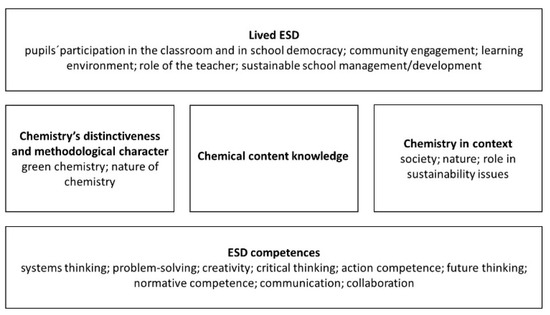 The Jegstad and Sinnes model revised in this paper consists of five categories: chemical content knowledge, chemistry in context, distinctiveness and methodological character of chemistry, ESD competences, and lived ESD [7] (see Figure 1 for our illustration of their model).