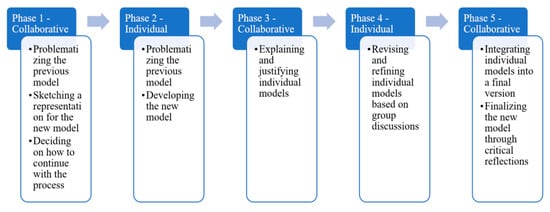 The development process was carried out in five phases (see Figure 2). In the first phase, the authors collaboratively decided how the development would be carried out and decided that the development process could include both individual and collective phases. In addition, it was decided that, for the development of the model, the contents of the model would be transferred from spheres to boxes. In the second phase, the authors individually created separate versions of the model by critically analyzing the old model and including aspects into the model based on the latest literature on the topic. In the third phase, the authors met and discussed their different views. In the fourth phase, the authors individually created their versions of the model by including aspects of the other authors’ preliminary model drafts. In the fifth phase, the final model was collaboratively negotiated and finalized by discussing on the various aspects.