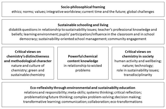 Firstly, the frames of sustainability-oriented chemistry are not visible in the original model. It must be asked what the foundations are when chemistry and sustainability are intertwined. Practical decisions in didaktik are made with certain values, ethics, and norms in mind [28], regardless of whether the teacher is aware of them. Furthermore, sustainability perspectives also play a role in setting goals for chemistry education [5].