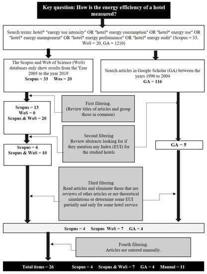 The following main keywords in the subject and title, in English, were used in the search: energy, hotel buildings, energy consumption, indicator, use, and intensity. The scope of this review was from 1995, which is when the indicator that measures energy efficiency in all areas of a hotel was published for the first time, until the beginning of 2019.