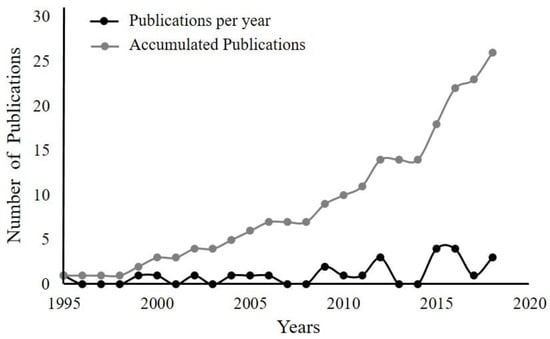 Only 26 scientific publications met the search criteria for this study. In Figure 2, publications per year and accumulated are shown. For the review period (1995 to 2019), the first publication was in 1995, and there were 9 years without publications, 10 years with one publication per year, 2 years with four publications per year, 2 years with three publications per year, and 1 year with two publications. The reasons for this behavior are unknown.