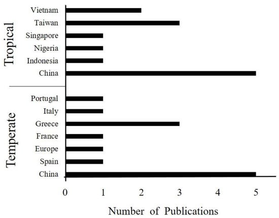 Figure 4 shows the publications by climate region and country. It should be noted that China has 38.46% of the publications, followed by Taiwan and Greece with 11.54% of the publications each. The remaining 38.46% of publications is distributed among the other countries. There are 13 publications on tropical regions and 13 on temperate regions. Among the 26 scientific papers used for this study, 65.38% are papers from Asia, 30.77% from Europe, and 3.85% from Africa. No scientific papers were found for America or Oceania, based on the criteria of this review.