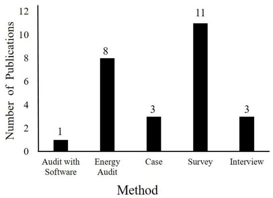Figure 5 shows the methods that were used in the publications to collect the data. Surveys were the most frequently used method in 42.30% of the publications, followed by energy audits in 30.77%, both cases and interviews in 11.54%, and an audit with software in 3.85% of the publications.