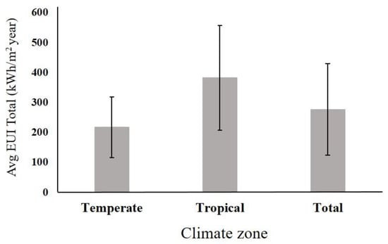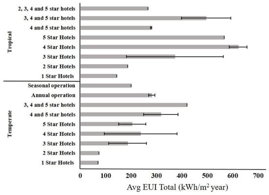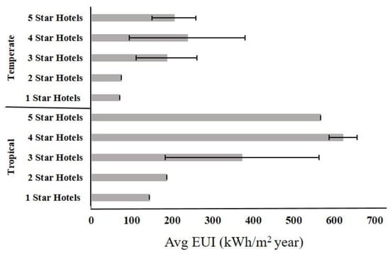 The average energy use index for hotels by category (one to five stars) is shown in Figure 6. Hotels in the tropics have higher average annual energy use intensity (avg EUI) rates than those in the temperate zones; the range of indexes in the tropical zone varies from 143.6 kWh/m2 year in one-star hotels to 621.14 kWh/m2 year in four-star hotels; while in the temperate zone the range is of 70.2 kWh/m2 year for one-star hotels and 237.15 kWh/m2 year for four-star hotels. The index of the four-star hotels was higher than that of the five-star hotels for the two climatic regions, temperate and tropical. The reason for this behavior was that the four-star hotels studied were older than 20 years; therefore, most of their HVCA systems and electrical installations were obsolete, which caused reduced performance and high energy consumption [23]. Regardless of the climate zone, the highest category hotels (i.e., five-star hotels) have a higher energy use index (429.1 kWh/m2 per year) than the one-star hotels (106.9 kWh/m2 year).