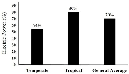 Relationship between the electric energy consumption (i.e., electrical power (EE)) with respect to the total consumption (%) for the temperate and tropical zones, as well as the general average. The x-axis indicates the climate zone and the y-axis indicates the electrical power (EE).
