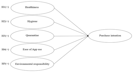 Figure 1 shows the research model. The dependent variable is purchase intention. In addition, this research used five elements as independent variables: healthiness, hygiene, quarantine, ease of app use, and environmental responsibility. This study proposes that the directions of all five variables are positive.