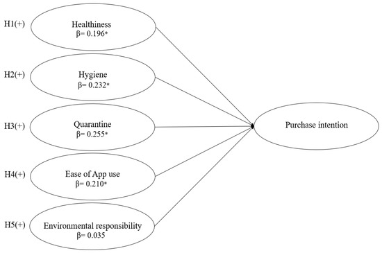 Table 4 illustrates the results of the multiple linear regression analysis. The dependent variable is purchase intention. Model 1 and Model 2 are statistically significant, given the significance of F-values (p < 0.05). The results show that healthiness (β = 0.196, p < 0.05), hygiene (β = 0.232, p < 0.05), quarantine (β = 0.255, p < 0.05), and ease of app use (β= 0.210, p < 0.05) are positively associated with purchase intention. It suggests that customers pay more for Starbucks goods and service if they perceive better healthiness, hygiene, quarantine, and more ease of use of the mobile software application. The results also present a significant effect of weekly use frequency on purchase intention (β = 0.113, p < 0.05), whereas other control variables are not significant. However, environmental responsibility appeared to be a nonsignificant attribute for purchase intention. All the hypotheses are supported other than hypothesis 5. It notes that environmental responsibility does not cause purchase intention directly. Figure 2 describes the results of hypotheses testing.