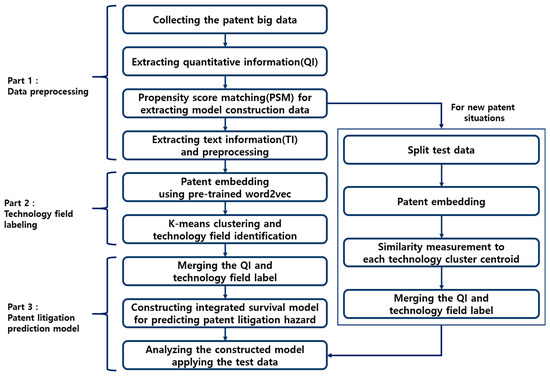 In this paper, we propose an integrated survival model using clustering and RSF to predict patent litigation hazards. The proposed model is largely composed of three parts. First, in part 1, the data required for model construction is extracted and preprocessed while solving the label imbalance problem of litigation patents. To this end, QI is extracted from the collected patent big data, and non-litigation patents with similar propensity scores to litigation patents are sampled at a ratio of 1:5 through propensity score matching (PSM). In addition, stop word removal and lemmatization are performed using text mining techniques for title, abstract, and patent claims. In part 2, the patent is embedded in a specific space through pre-trained word2vec. The technology fields are identified by using K-means clustering in embedded patents and technology field labels are assigned to each patent. In part 3, the extracted QI and technology label are merged to build an integrated survival model. Finally, testing data is input to the built model to evaluate its predictive performance for patent litigation hazards. Figure 1 below is a schematic diagram of the methodology proposed in this study.