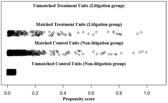 As shown in Table 3, it was found that the QIs between the two groups were dissimilar before performing PSM. However, after sampling non-litigation patents through PSM, most of the QIs were found to be similar. Figure 2 below shows the propensity score of the data sampled through PSM as a plot.