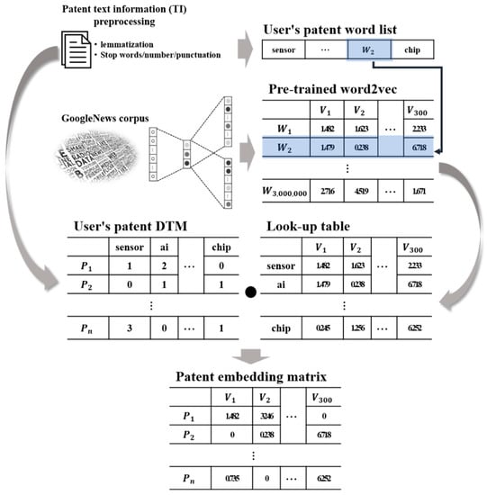 The pre-trained word2vec has learnt from the Google News corpus and contains the result of embedding 3 million words into a 300-dimensional space as a real number [41]. In this paper, the word list and Document-term matrix (DTM) are derived by performing preprocessing on the patent TI. Using the word list, the matching embedded values are called from the pre-trained word2vec, and a look-up table specific to the patent is constructed. Finally, a patent embedding matrix is derived through matrix multiplication of the DTM and the look-up table. Figure 3 below is a schematic diagram of the patent embedding process.