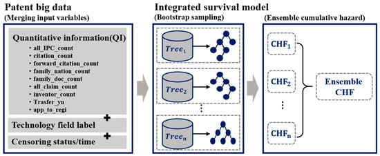In this paper, we propose a method of predicting litigation hazards over time taking into account varied patent information and censored data. To this end, the QI extracted in part 1 and the technology field label derived in part 2 are merged and used. Moreover, censored data is set based on the litigation status up to the point of data collection. The integrated survival model proposed in this paper uses a random survival forest based on an ensemble tree during survival analysis. Figure 4 is a schematic diagram of the construction process of the proposed integrated survival model.