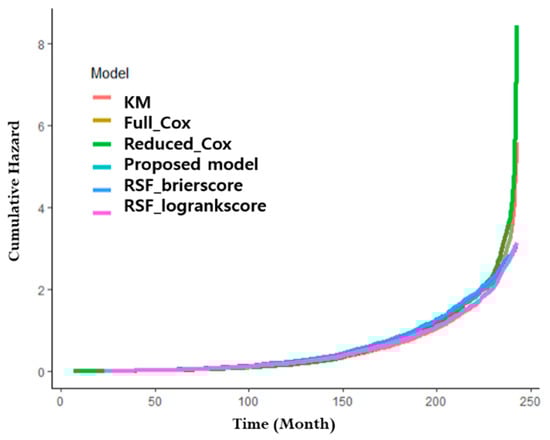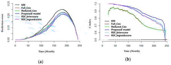 The prediction error curves in Figure 7 show that the values of all models increase over time. Of them, KM has the largest prediction error values while the proposed model has the lowest prediction error values. In the case of C-index, the value of KM is almost unchanged from 0.5, and the CoxPH models have values ranging between 0.9 and 0.7. In addition, the RSF models mostly maintain high C-index values.