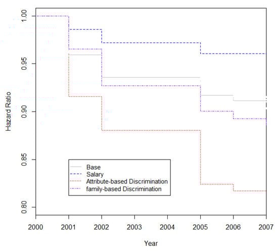 Based on this, we adopted a Cox proportional hazards model to estimate the self-employment rates of female lawyers. The Cox proportional hazards model is useful to explicitly to test time-dependent events [37]. Also, compared to the parametric hazards models, which explicitly require a specified baseline model, the Cox proportional hazards models implicitly assume a base model. Thus, the latter is more flexible to build estimation models, and also helps prevent making arbitrary assumptions about the baseline model. The estimation model is seen as follows: