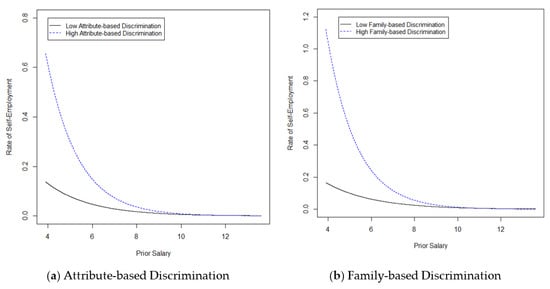 Interaction effect of prior salary and discrimination on the rate of self-employment: (a) The relationship between prior salary and rate of self-employment, which is moderated by attribute-based discrimination; (b) The relationship between prior salary and rate of self-employment, which is moderated by family-based discrimination.
