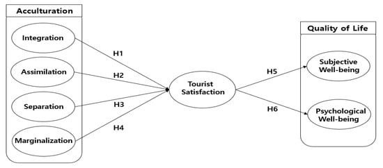 Based on the above literature review and research hypotheses, this study constructs a structural equation model about acculturation, tourist satisfaction, and quality of life. All hypotheses are shown in Figure 1.