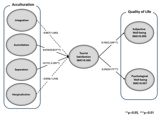 The degree to which endogenous variables were set in the structural model was explained by exogenous variables or other endogenous variables that could be examined by the squared multiple correlation (SMC). The SMC corresponds to the coefficient of determination R2 in regression analysis; 43.3% of tourist satisfaction was explained by integration, assimilation, separation, and marginalisation of acculturation, and among the quality of life, 5.9% of life satisfaction was explained by acculturation (integration, assimilation, separation, and marginalisation) and tourist satisfaction, while 3.7% of psychological well-being was explained by acculturation (integration, assimilation, separation, marginalisation) and tourist satisfaction. The hypothesis of the relationship between the variables was verified and found to be significant in four paths in a total of six.