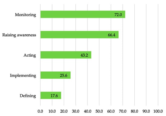 (2) In the second subsection, we asked if the respondents were familiar with the notion of the SDGs (four options: No never; I am not sure; Yes, but do not know much about it yet; and Yes, they are familiar to me). We proposed five fields of action to select from together with a short definition: raising awareness (recognizing problems, informing and publishing, sensitizing), defining (set goals or new indicators), monitoring (collecting, processing, and making data available), implementing (implement concrete measures, create offers, solve problems), and acting (enable sustainable behavior of people, promote engagement, etc.). For each of these five fields of action, we asked for examples from concrete project work in an open format. Due to the very high number of mentions (395; see Table 4), we have not yet been able to conduct an in-depth qualitative data analysis. Therefore, two colleagues examined the data through a simple content analysis.