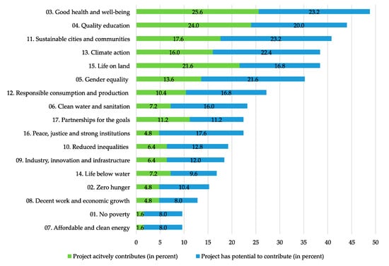15]. They developed a category system to identify how citizen science projects are connected to the SDGs. They show thematic references to 12 of the 17 goals. Goal 15 (Life on land) is also in first place in this study, with 48 thematically linked projects. In the second place, the authors see goal 4 (Quality education) with 33 projects, followed by goal 13 (Climate action) with 22 projects and goal 11 (Sustainable cities and communities) with 10 linked projects.