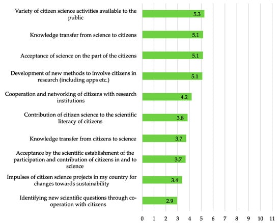 It would be worthwhile to further underpin our cross-sectional approach with case-control studies. It would be particularly interesting to investigate countries in which citizen science is not yet structurally driven, e.g., through national funding or citizen science platforms. We are aware too that the use of an online questionnaire primarily focusing on quantitative data can lead to a selective approach to people and thus exclude target groups that could be better reached through other (qualitative social science) methods such as interviews, group discussions, or systematic observations. To better understand the potential of citizen science projects and the self-assessment of this internationally, it is pivotal to hear and respond to the own voices of projects and project coordinators. The many examples given by the respondents for the fields of action illustrate the diversity of the projects. They are also evidence that the respondents have an interest in sharing and discussing their experiences with the community. Our simple data analysis initially presents only subjectively selected examples. However, as the dataset is publicly available, colleagues could do further categorization and analyses in the future.