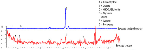 Figure 1. X-ray diffraction (XRD) pattern of the sewage sludge (SS, red line) and sewage sludge biochar (SS-BC, blue line) showing different minerals.