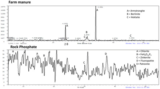 Figure 2. X-ray diffraction (XRD) pattern of the farm manure (FM) and rock phosphate (RP).