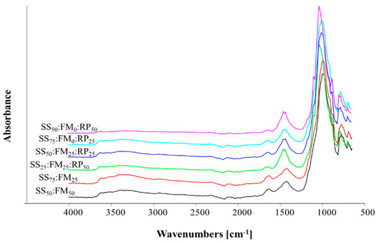 Figure 3. Fourier transform spectra of the co-composts of different treatment mixtures in ratios where SS = sewage sludge, FM = farm manure, RP = rock phosphate.
