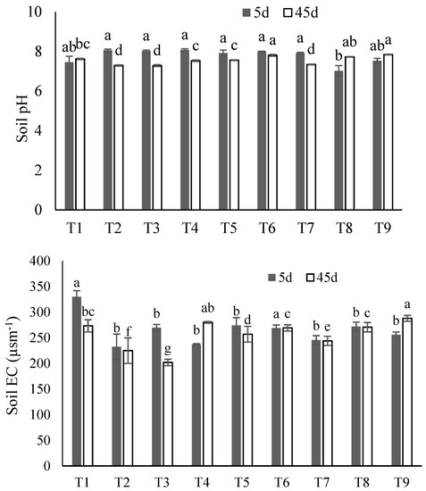 The post-incubation soil pH was not significantly affected by any of the treatments after either the 5 or 45 days of incubation (Figure 4). For most treatments, soil EC was significantly higher after 5 days of incubation. The maximum EC (330 µSm−1) was observed in control treatment after 5 days, while the soil EC was lower for all other treatments when compared to control (Figure 4).