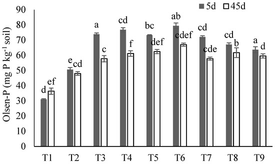 The soil Olsen-P was analyzed after 5 and 45 days of incubation and showed the significant variation between treatments at both time intervals (Figure 5). After 5 days of incubation, the maximum Olsen-P was in T6 (79.41 mg kg−1 soil) and T4 (76.79 mg kg−1 soil), and the minimum in T2 (50.41 mg kg−1 soil) and T1 (control) (31.01 mg kg−1 soil). Whilst a similar trend was seen after 45 days of incubation, the observed Olsen-P values were lower overall.