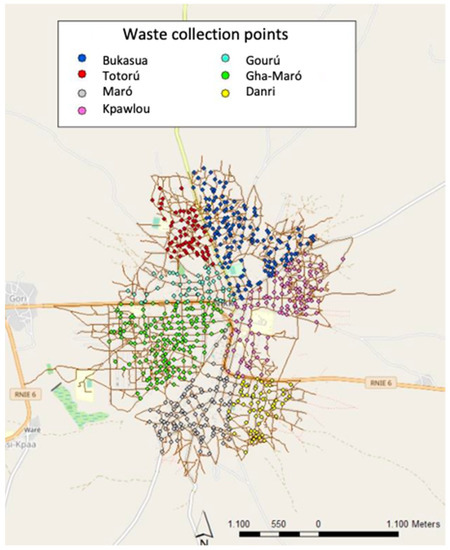 This paper offers a methodology for these situations and shows its application to a real case study. Moreover, in each step of the methodology, decisions must be made in order to go on. The decisions must always be adapted to the resources of the town. In this study, decisions were adopted by considering the situation of Nikki. Therefore, for this specific case and taking all the parameters related to municipal waste collection into account, the fractions into which the waste should be separated are plastics, organic matter, and a reject fraction consisting of the remaining materials. Two types of collections points were defined. The first type of collection point was located in the courtyards, next to the households, and, consequently, next to the inhabitants. This decision was made due to the particular distribution of the households around the town and due to the fact that the bins should be as near to the inhabitants as possible to achieve a good rate of participation of the people. The second type of collection point was located in the main streets of the town, next to the courtyards, as the collection vehicles could not enter some secondary streets to access the courtyards.